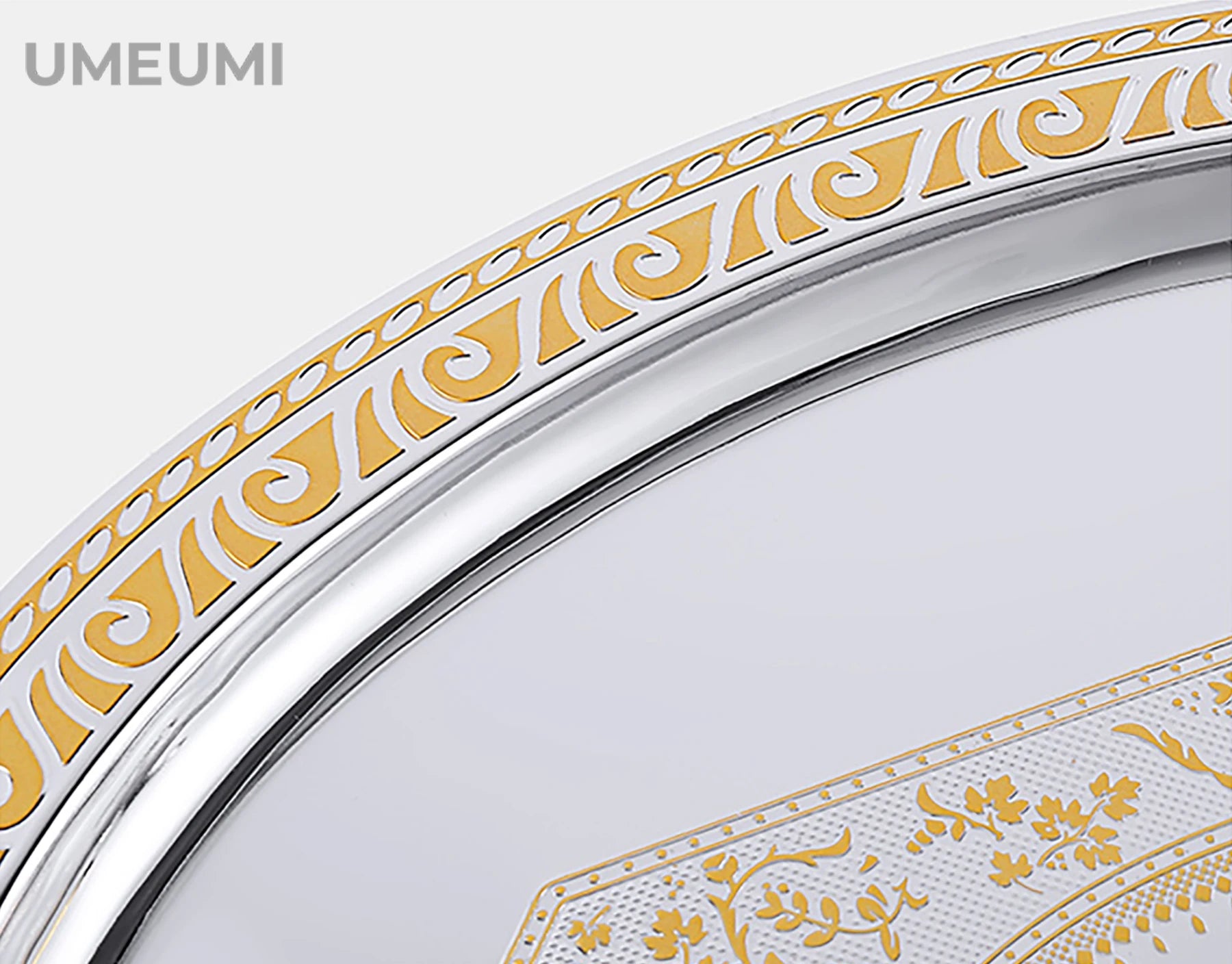 Material: bandeja em aço inoxidável de alta durabilidade; alça: em resina com acabamento em ouro puro (substituição recente).
