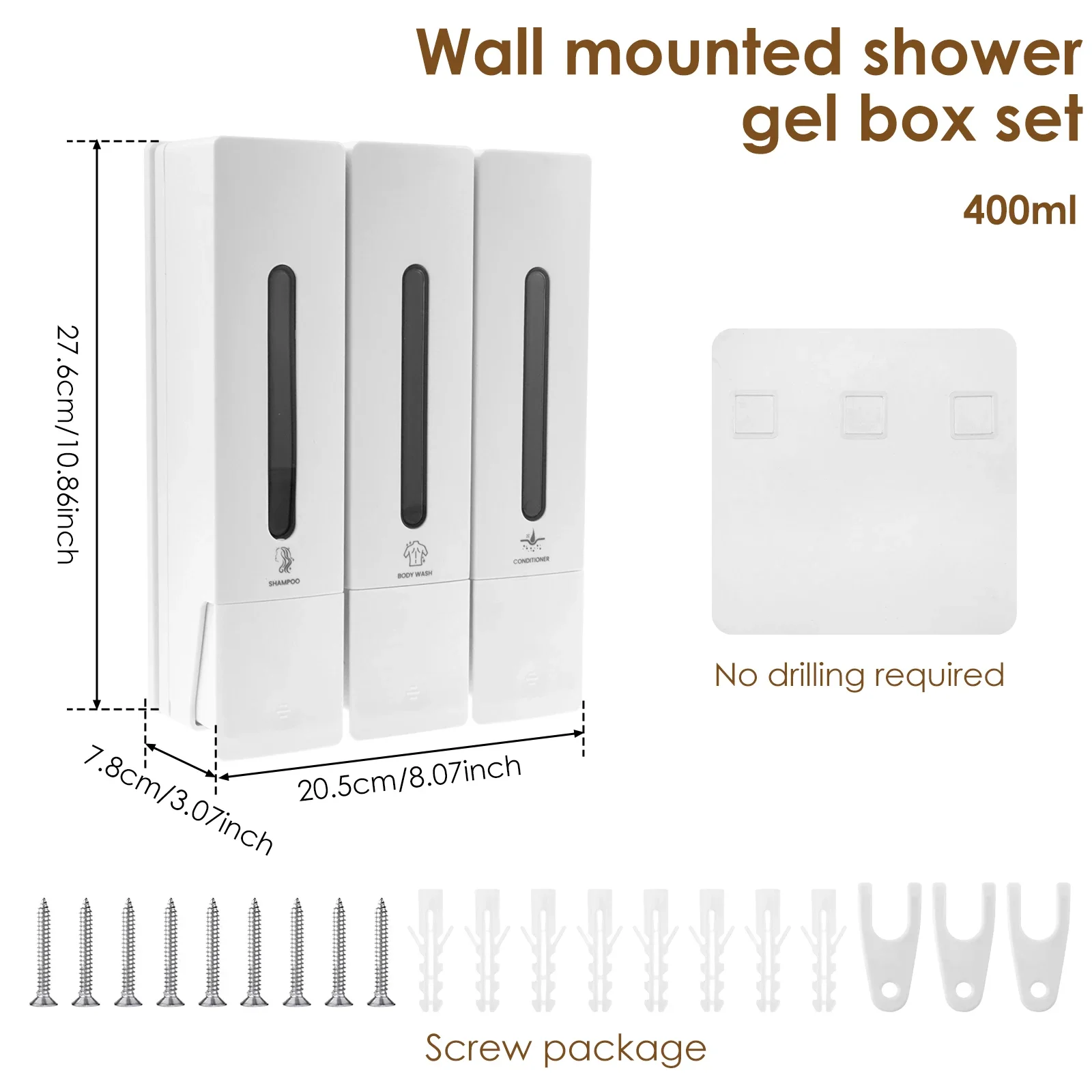 Conteúdo da embalagem: 1 dispenser de sabão para chuveiro, 1 adesivo, 3 pacotes de parafusos.