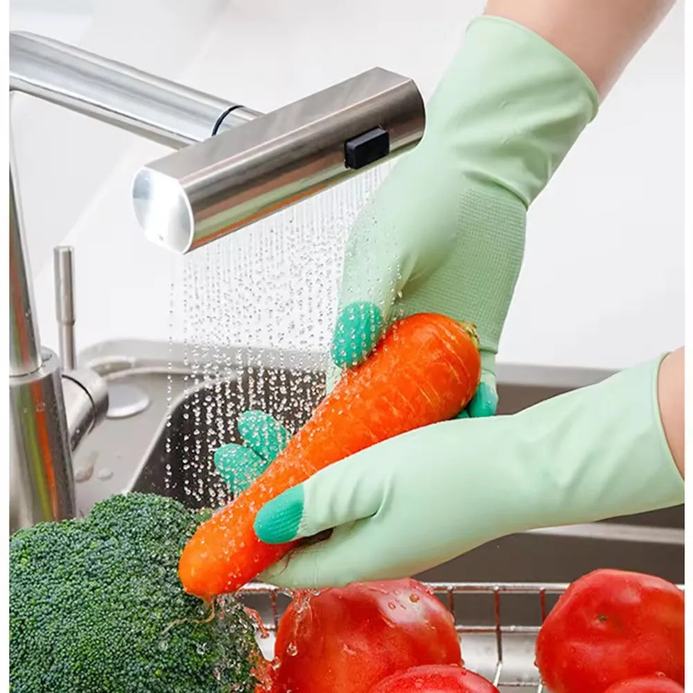 Luvas de limpeza para louça em silicone com acabamento antideslizante, projetadas para uso doméstico diário. Reutilizáveis e duráveis, são ideais para quem busca proteção prática e aderência superior ao lavar pratos, panelas e utensílios.