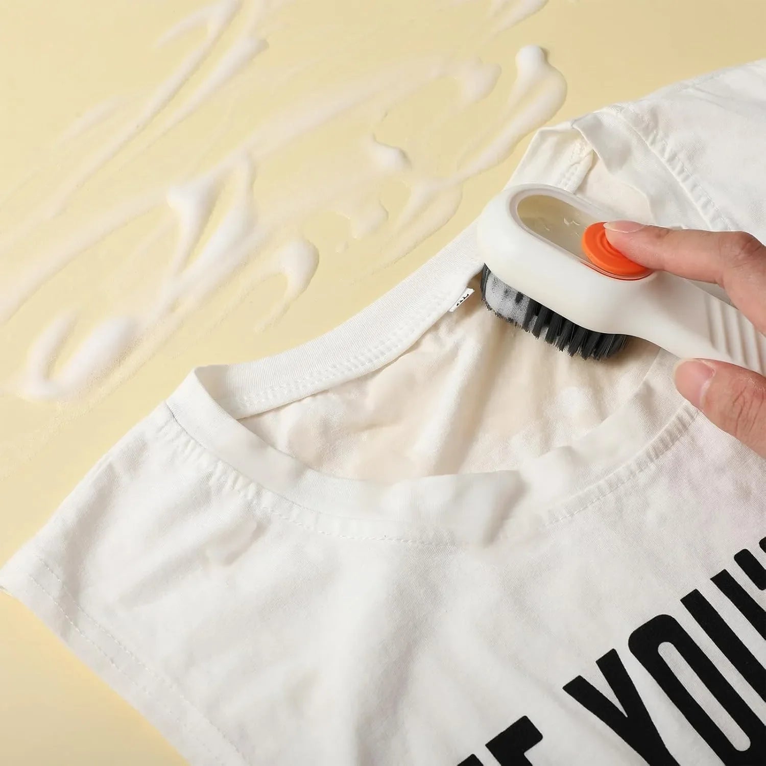 Design multifuncional 2 em 1: escova para sapatos com dispensador de líquido integrado e função de pressão para uso doméstico.