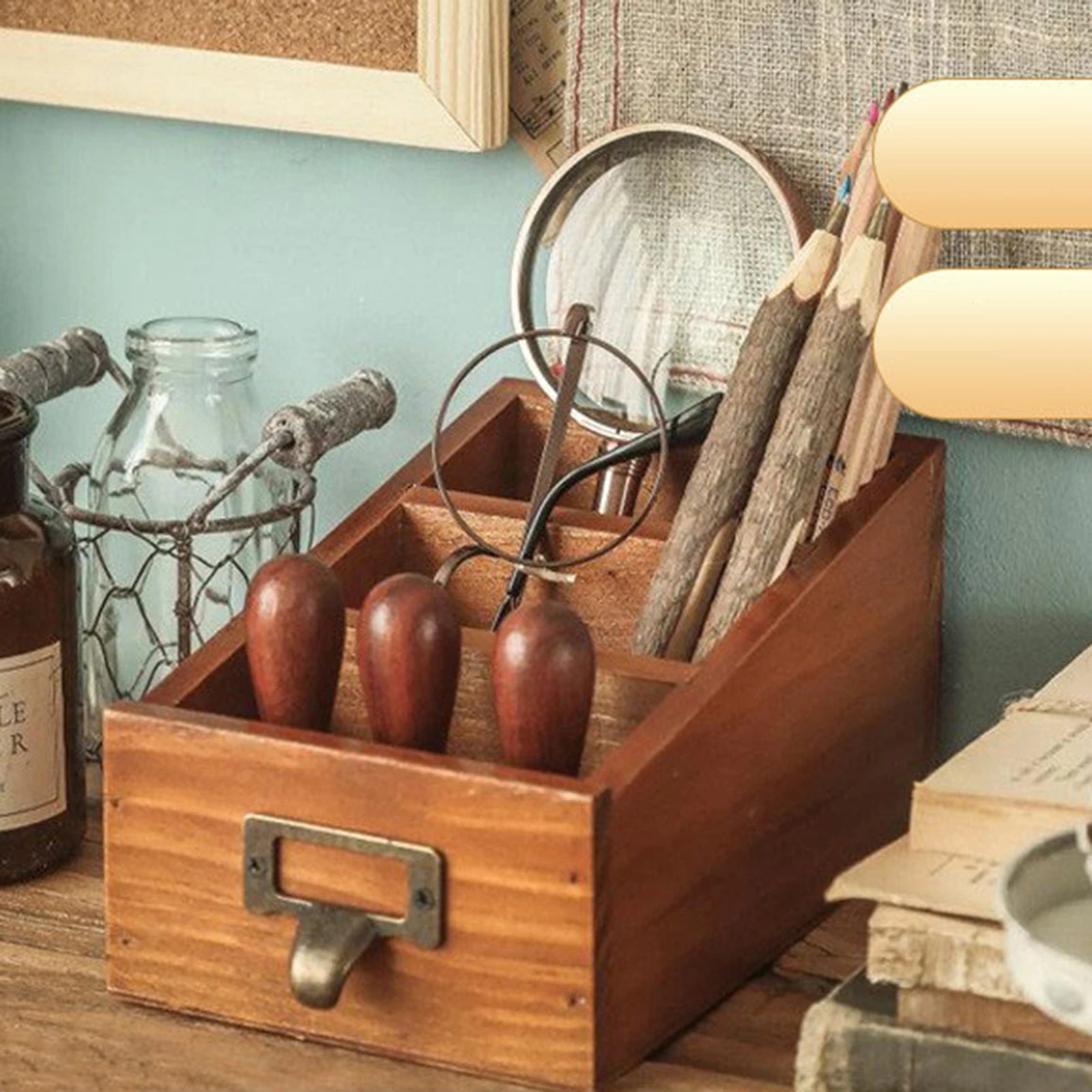 Organizador De Mesa Madeira Organiza Tudo é um organizador de mesa em madeira com toque vintage, ideal para quem precisa manter remotes, itens de papelaria e maquiagem bem organizados no espaço de trabalho ou na bancada de estudo.