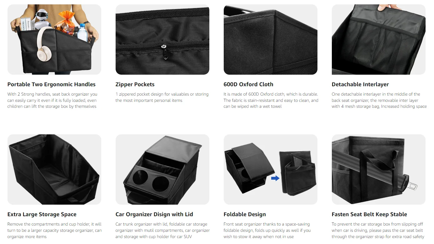Transforma a bagunça do porta-malas em uma solução organizada e de fácil acesso, economizando tempo na busca por itens. Mantém mantimentos, ferramentas e equipamentos sempre à mão, evita derramamentos e facilita a limpeza. Quando não estiver em uso, o organizador se dobra compactamente para liberar espaço no porta-malas e, ao mesmo tempo, facilita o armazenamento em casa ou no veículo — ideal para viagens, compras semanais e passeios com a família.
