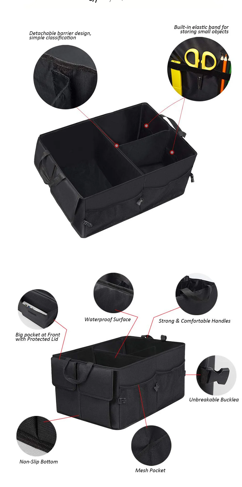 - Mantém itens do porta-malas separados e acessíveis, facilitando a localização rápida.