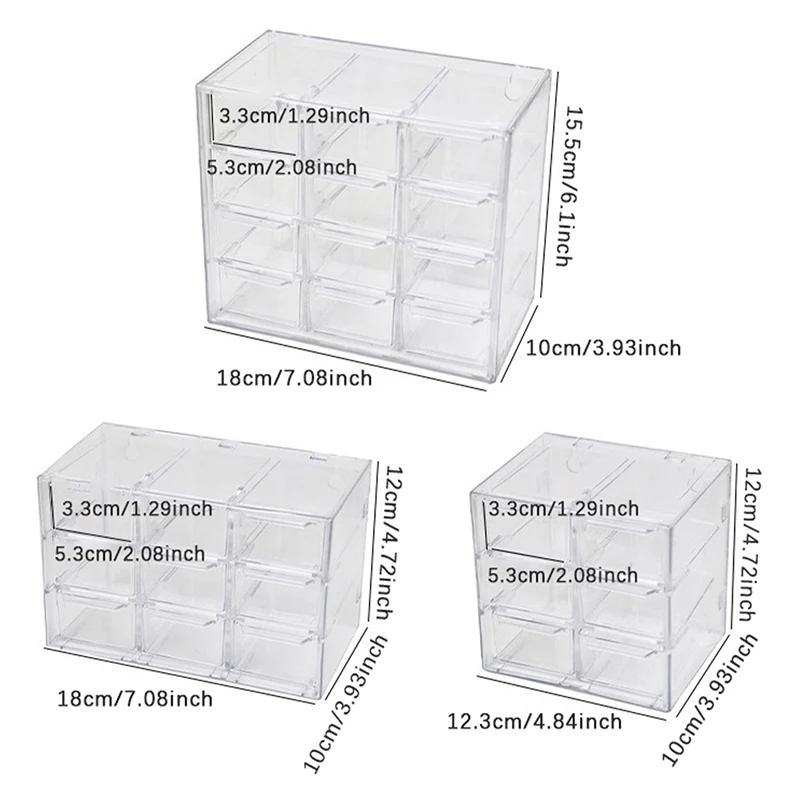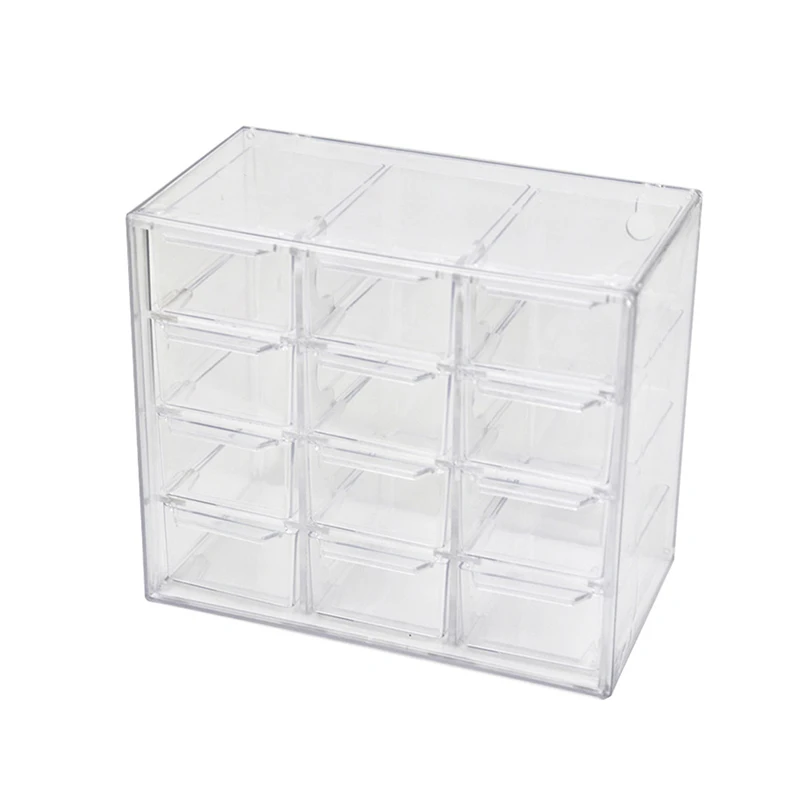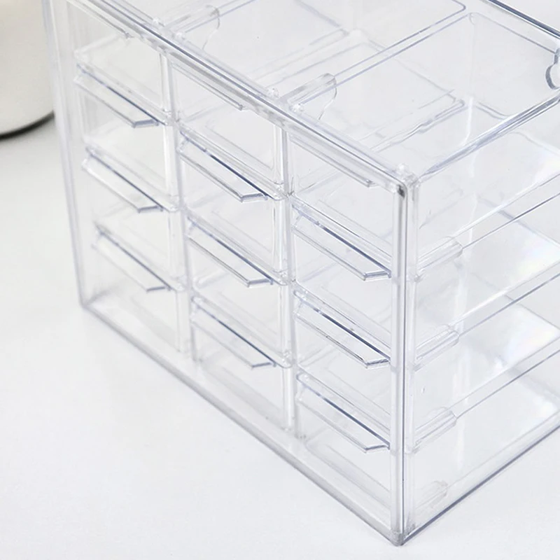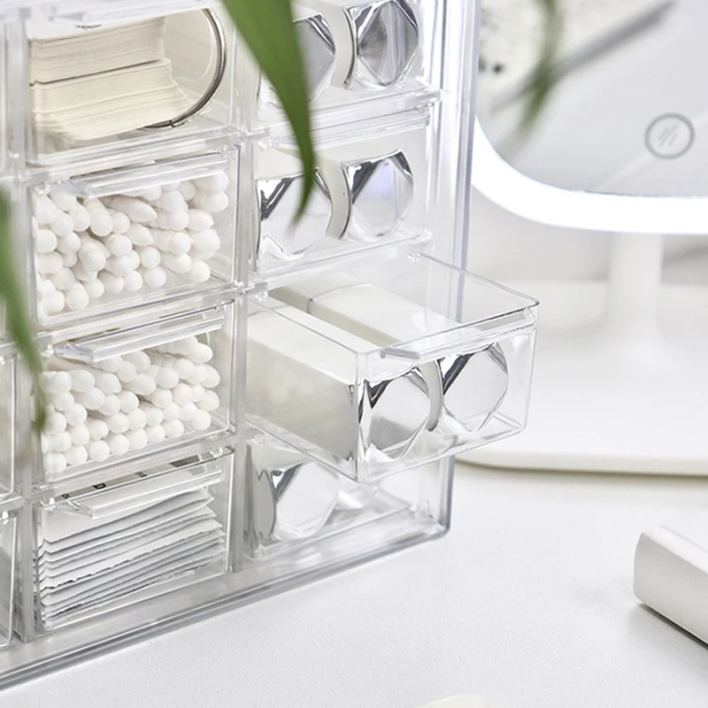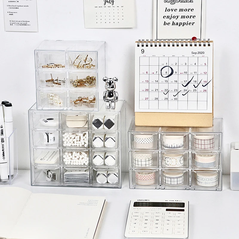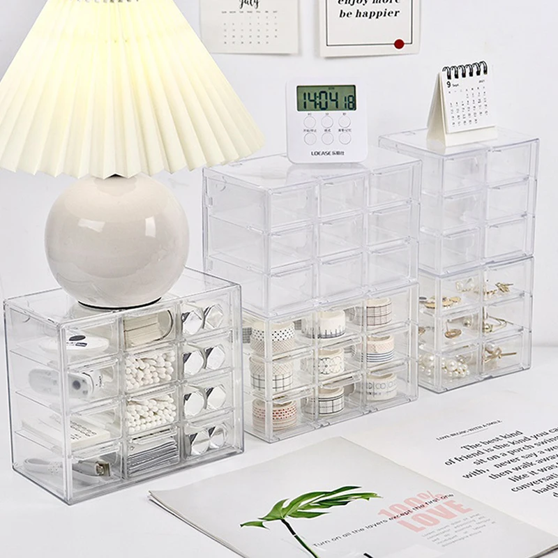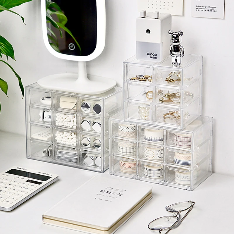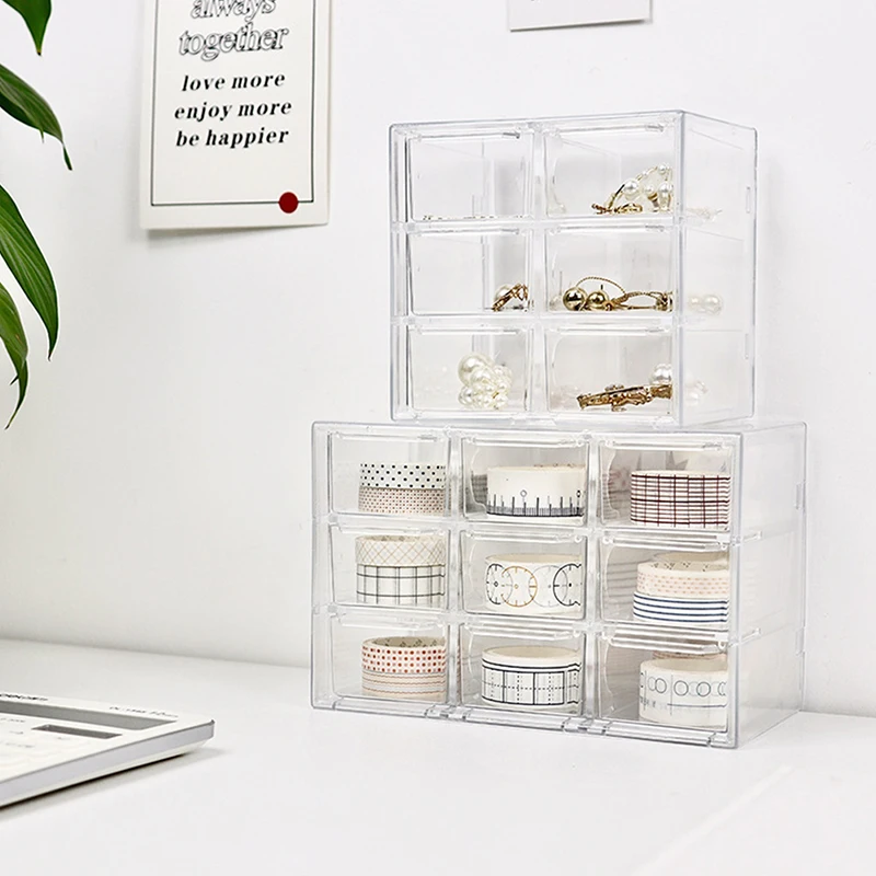 Organizador transparente de joias com gavetas empilháveis para mesa, design moderno em PS. Ideal para quem busca uma solução prática para manter joias, acessórios e itens pequenos sempre à mão, com visual limpo e discreto.